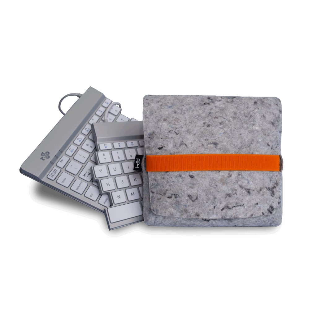 Deze beschermende etui is van zacht, stevig vilt, gemaakt uit gerecycled textiel. De R-Go Pouch is vierkant en compact, de twee helften van een Split toetsenbord passen er tegen elkaar liggend perfect in. Een oranje elastieken band sluit het tasje af en geeft hem gelijk een trendy uitstraling. Speciaal ontwikkeld om je Split toetsenbord makkelijk en veilig mee te nemen: ergonomie in the pocket!